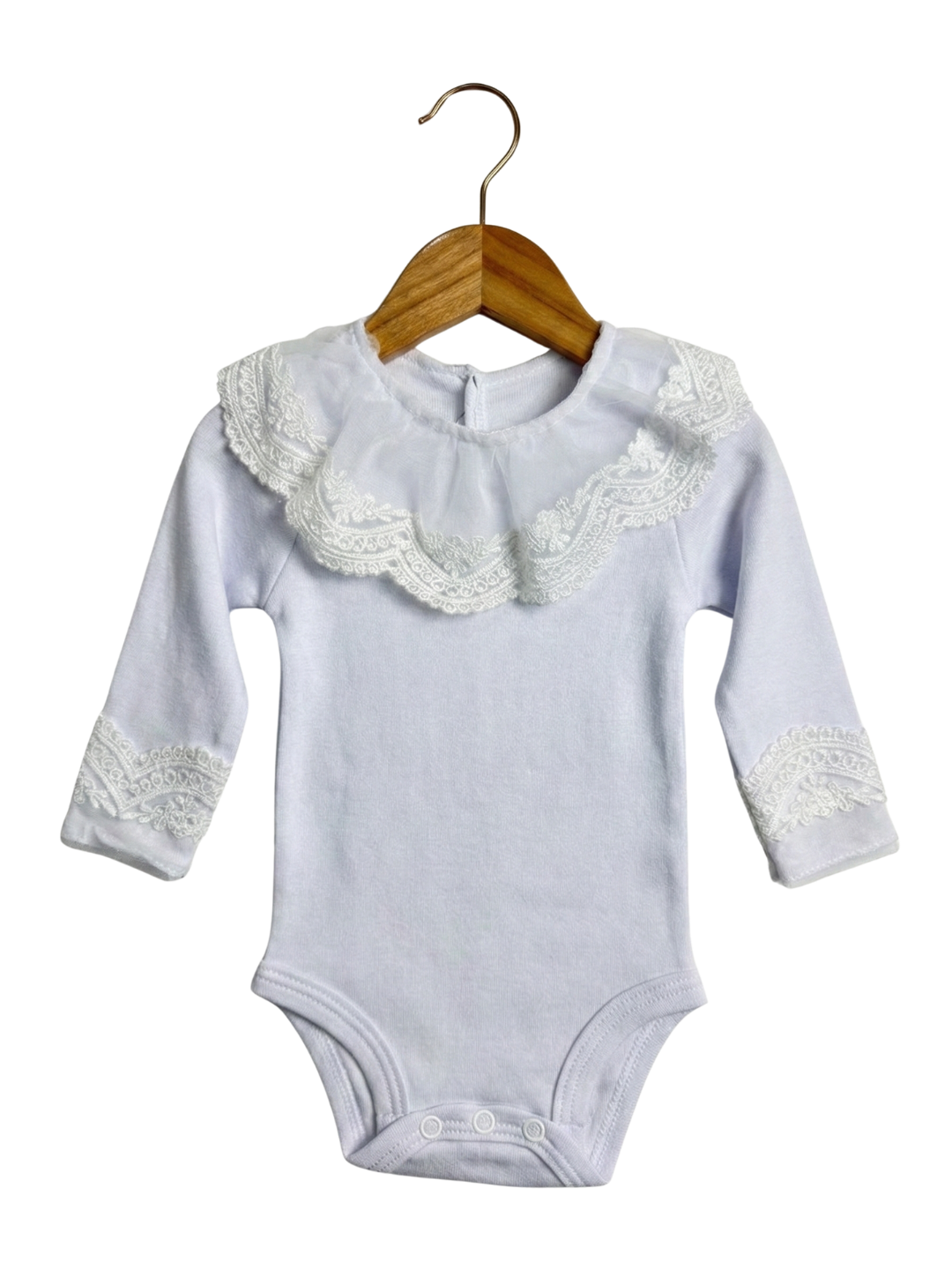 Um clássico cheio de charme e delicadeza! Nosso body com gola de renda é confeccionado em 100% algodão, proporcionando o máximo de conforto e suavidade para a pele sensível do bebê.