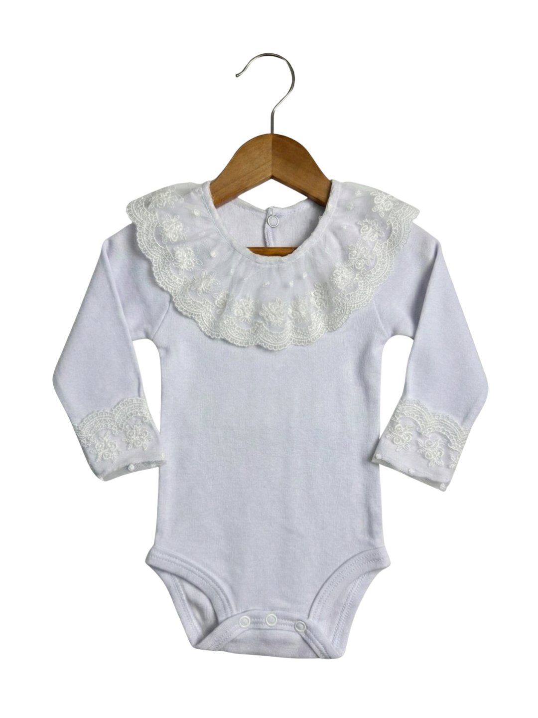 Um clássico cheio de charme e delicadeza! Nosso body com gola de renda é confeccionado em 100% algodão, proporcionando o máximo de conforto e suavidade para a pele sensível do bebê.