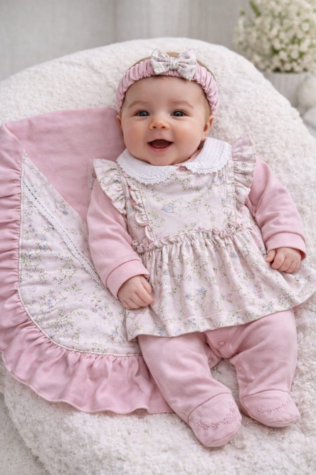 Macacão com uma estampa florida, apresenta um macacão para dar aquele toque a mais à sua peça. Manta estampada. Contando com 1 tiara e 1 vestido. Tudo isso pra garantir o conforto e a beleza que a sua princesa merece.