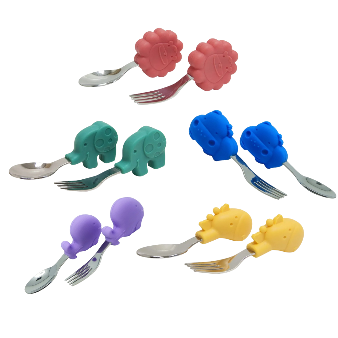 O jogo de garfo e colher em silicone e aço inox é indicado pra bebês que já tenham dentes. Os talheres têm formato anatômico, com cabo pequeno e em 90°, para que se encaixem mais facilmente nas mãos das crianças e ajudar no treinamento motoro para refinar a pega.