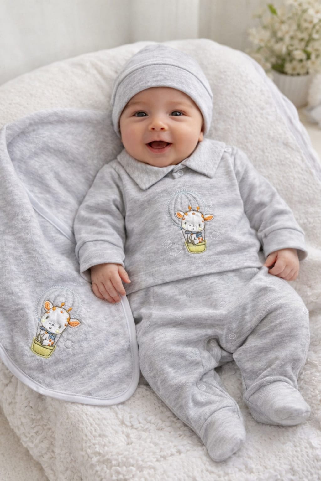 Macacão com um bordado de girafinha, apresenta um macacão para dar aquele toque a mais à sua peça. Manta com o bordado de girafa. Tudo isso pra garantir o conforto e a beleza que o seu principe merece.