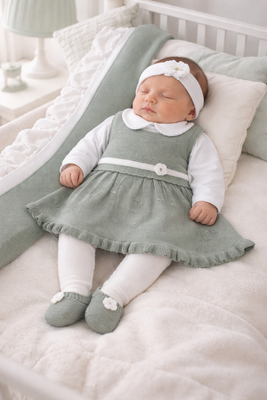 A saída maternidade em tricô de linha acrilíca, proporciona beleza e conforto para a pequena que acabou de nascer. A saída é composta por um lindo vestido, um body 100% algodão, uma meia calça, uma tiara, um sapatinho e uma manta 78x78cm.
